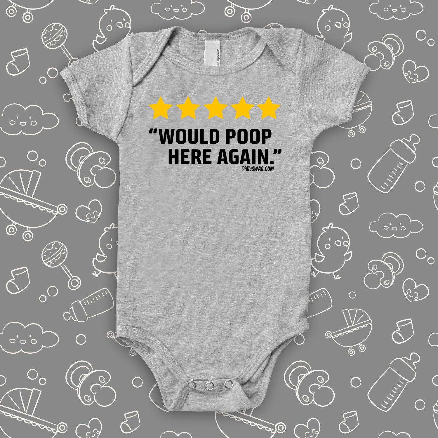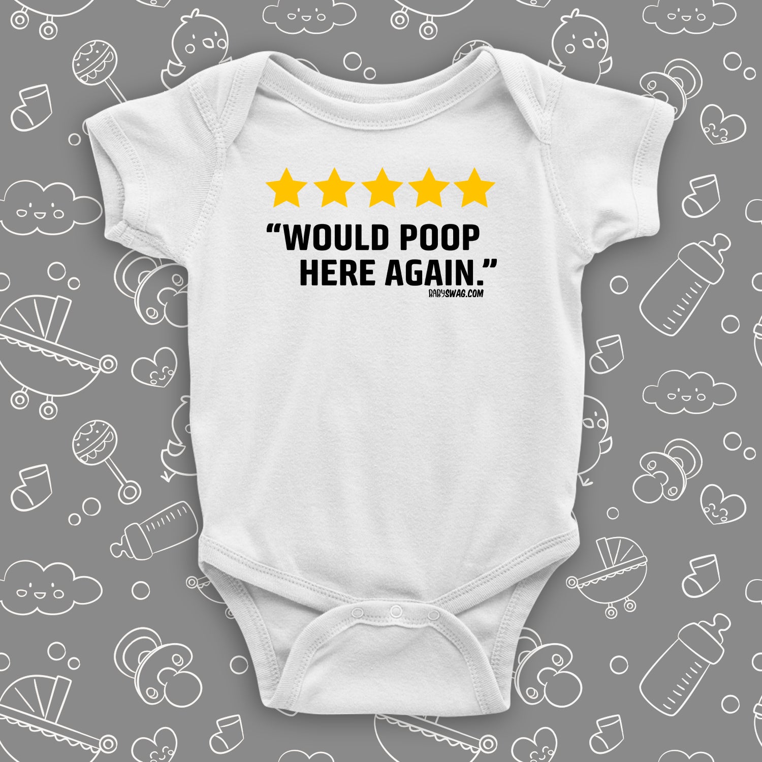This hilarious baby onesie is the best testament to luxury that your child is used to. With the caption "5 Star: Would Poop Here Again", you will surely get a chuckle out of your friends and relatives, while providing maximum comfort to your baby.