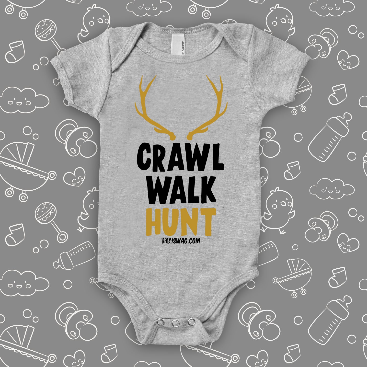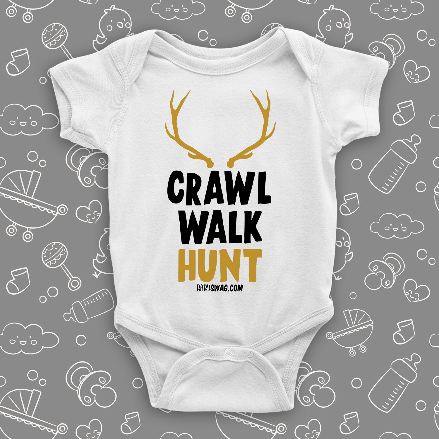 Teach your little bundle of joy what he is expected to do while growing up. After crawling and walking it is time to learn how to hunt as real men do. This graphic baby boy onesie with "Crawl Walk Hunt" printed would be a good reminder!