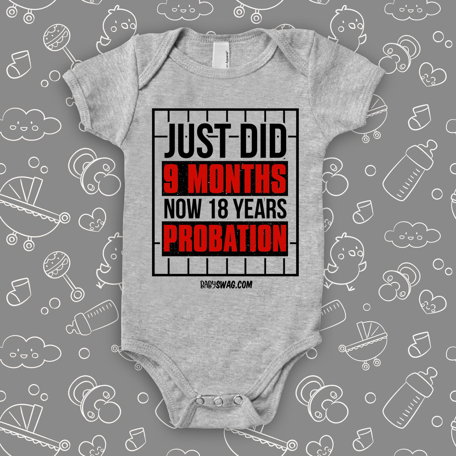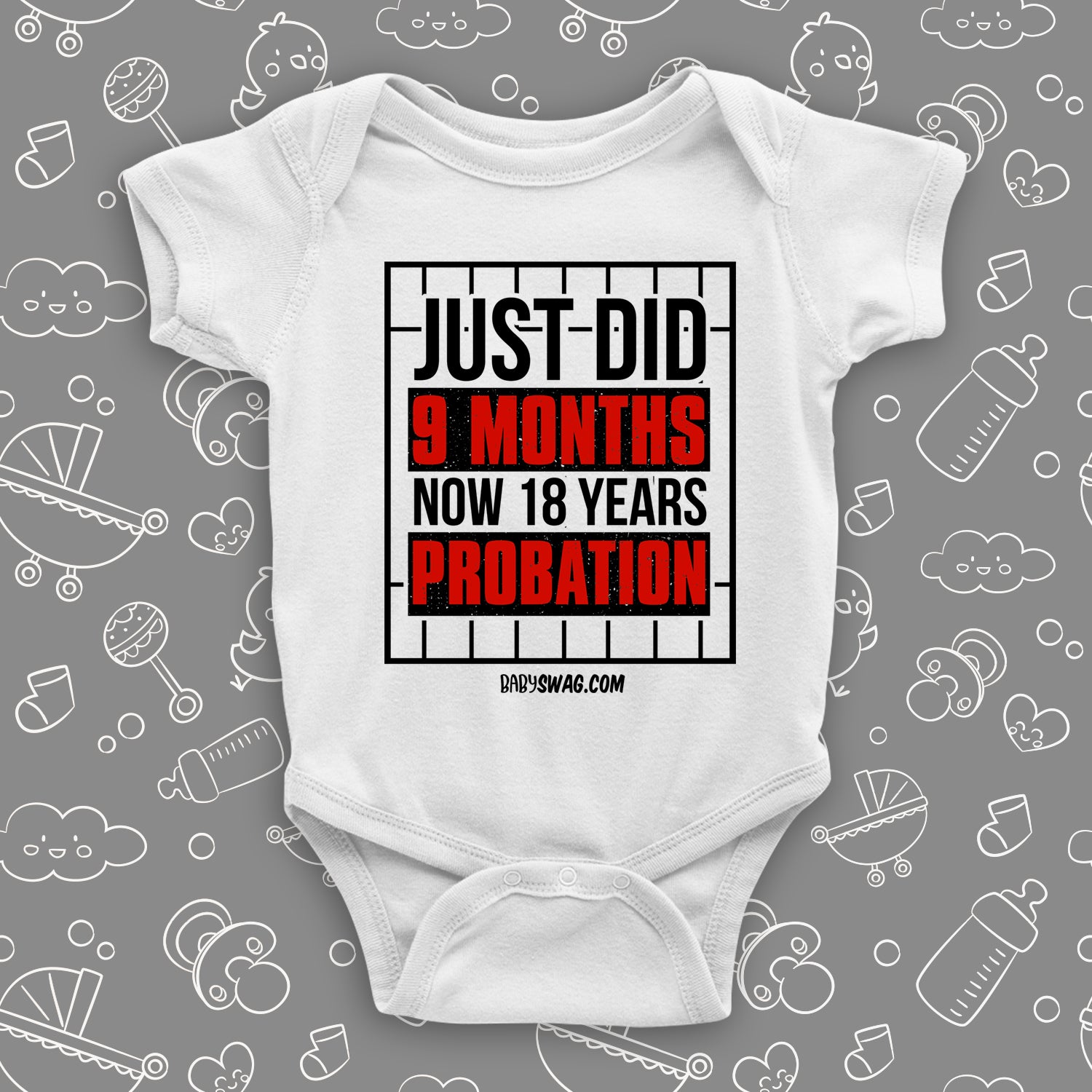 It will be a while before your baby can appreciate all that you do - until then, they might feel like they "Just Did 9 Months, Now 18 Years Probation". Say what they cannot yet with our graphic baby onesies!