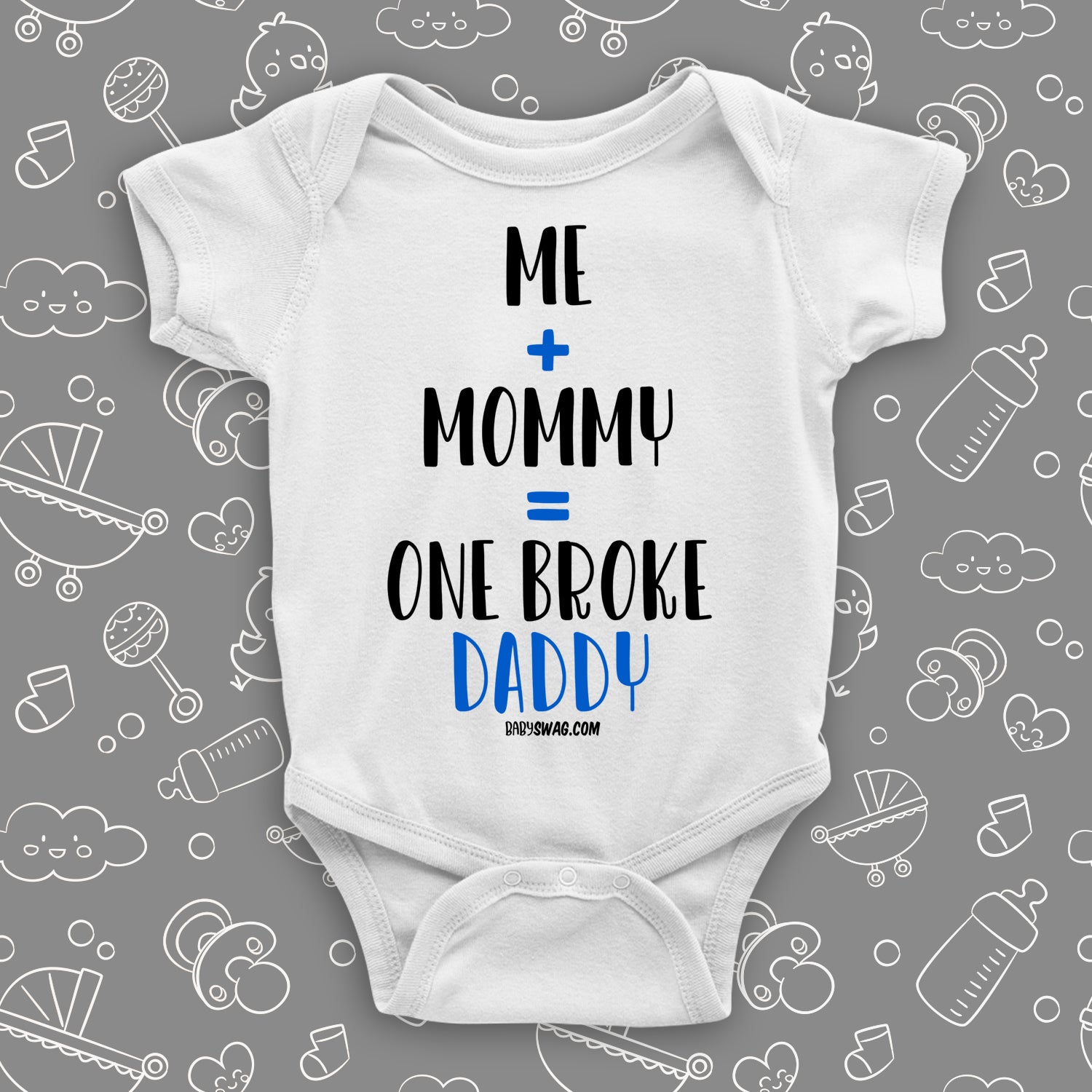 A Daddy that loves spending money on his family and wants the world to know it! You will love this funny baby onesie with the caption "Me + Mommy = One Broke Daddy", as it is made from 100% cotton, and is 100% hilarious.